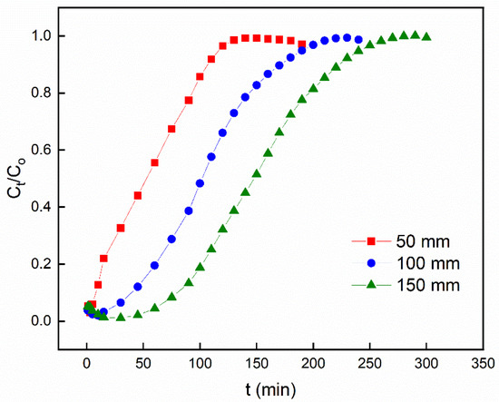 Figure 6 shows the breakthrough curve for Pb2+ adsorption on PACC at three distinct bed heights (50 mm, 100 mm, and 150 mm). The flow rate was held steady at 6 mL min−1, pH at 6, and the inlet concentration of Pb2+ was kept constant at 50 mg L−1. The experimental results show that elevating the bed height from 50 mm to 150 mm resulted in an extended time for the bed to achieve saturation. This observation implies a correlation between the breakthrough curve and the bed height, indicating an expansion in the zones of mass transfer [41]. Additionally, Figure 6 demonstrates that reducing the bed height resulted in a more rapid saturation. Meanwhile, increasing the bed height to 150 mm improved the removal efficiency. Similar studies have observed that these findings are influenced by the augmentation of active sorption sites and the prolongation of duration of contact between PACC and Pb2+ [42,43].