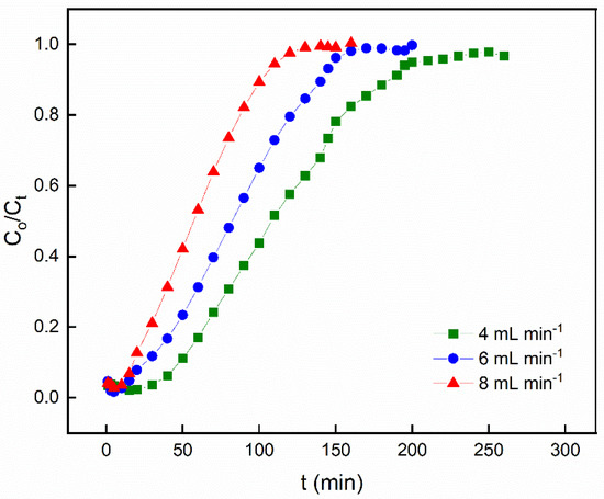 To examine the influence of flow rate on Pb2+ adsorption using PACC, the flow rate was subjected to variation (4, 6, and 8 mL min−1), keeping a consistent adsorbent bed height of 100 mm, a pH level of 6, and a constant inlet concentration of Pb2+ at 50 mg L−1. The outcomes of this investigation are presented in Figure 7, where the breakthrough curve is depicted. The findings indicate a significant enhancement in breakthrough occurrence with the escalation of flow rate. Conversely, along with the decreasing flow rate, there is a significant extension of the duration required to reach saturation. At lower flow rates, there was more time for the interaction between Pb and PACC, resulting in an augmented removal of Pb2+ in the column.