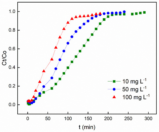 An elevated influent concentration results in a more pronounced incline of the breakthrough curve and a shorter breakthrough time, in accordance with findings from previous studies [48]. These results suggest that the concentration affects the level of saturation and breakthrough time, implying that the dispersion mechanism is influenced by the influent concentration. An increase in the influent concentration led to an increase in the driving force for mass transfer, leading to a decrease in the length of the adsorption zone [22,49]. These findings are congruent with prior studies conducted on numerous fixed-bed adsorption frameworks [47,50].