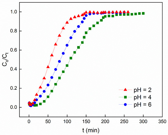 The pH values exert a critical influence on various aspects of heavy metal behavior within the environment. Beyond its influence on the dissociation of heavy metal sites, pH exerts a substantial impact on solution chemistry by contributing to various processes, including redox reactions, hydrolysis, complexation with organic and/or inorganic ligands, and precipitation. The pH significantly governs these mechanisms and consequently has a notable effect on the availability of heavy metals for biosorption [51]. To assess how pH levels affect the efficiency of Pb2+ adsorption by PACC, a series of pH values ranging from 2 to 6 were utilized for investigation. Throughout this experimentation, the bed height (100 mm), flow rate (4 mL min−1), and initial concentration (50 mg L−1) remained constant. As shown in Figure 9, the breakthrough curve at pH = 2 shifted towards the left, indicating a shorter breakthrough time. This occurrence can be explained by the higher concentration of hydronium ions at lower pH levels, which competes effectively with Pb2+ ions for interaction with the active sites of PACC [52]. Although at pH values greater than 6, Pb2+ ions undergo solvation, hydrolysis, and lead oxide precipitation [53]. These precipitates are unable to be adsorbed by the PACC foam, leading to a decrease in the breakthrough time, which occurred at 240 min. Hence, at a moderate pH (pH = 4), these circumstances can be mitigated, resulting in the longest breakthrough time.