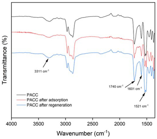 Fourier transform infrared (FTIR) spectra of polyurethane-activated carbon composite (PACC), PACC after Pb adsorption, and PACC after regeneration.