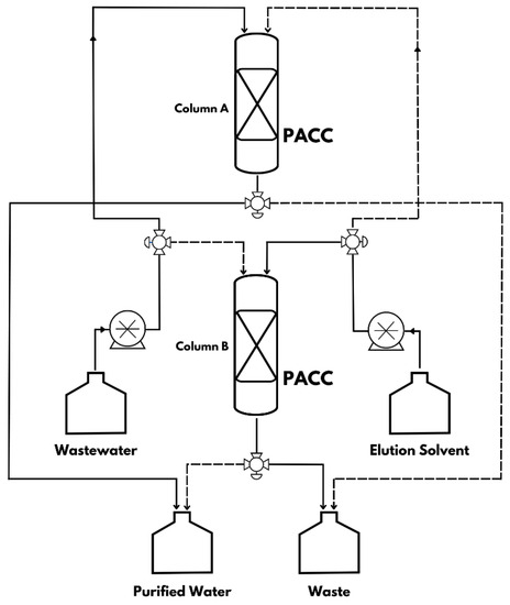 A proposed industrial setup for wastewater treatment is depicted in Figure 12. To showcase the practicality of a continuous adsorptive water treatment method, a rotating pattern of two parallel columns can be utilized for wastewater treatment, as illustrated in Figure 12. Each column can be filled with 50 g of PACC adsorbent and utilized for uninterrupted processing. Once 2.5 L of wastewater has been treated in Column A, the wastewater feed will be directed to Column B, while Column A undergoes simultaneous regeneration using the elution solvent. This method offers the advantage of simultaneous adsorption-desorption processes, therefore circumventing the drawbacks associated with conventional adsorbents, which necessitate costly operating and manufacturing methods, resulting in potential secondary pollution. The suggested approach is expected to mitigate environmental and health risks in comparison to alternative methods. A comprehensive life cycle assessment (LCA) can provide further evaluation and assessment of the environmental impact and sustainability aspects of this approach.