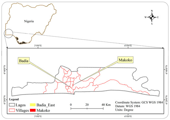 This investigation focuses on two popular areas, Badia-East and Makoko, to unravel the intricate spatial relationship between patterns in these marginalized communities in Lagos. Situated on Nigeria’s Atlantic coast, Lagos has become a destination for those searching for better economic prospects. Being the biggest city in Nigeria and a significant financial center, Lagos has seen quick urbanization and a rise in population. However, owing to this rapid expansion, the city’s infrastructure and housing development have failed to keep up, resulting in informal settlements and slums [1,26]. This situation disproportionately affects low-income people compelled to reside in substandard housing due to the limited availability of affordable options. Figure 2 is a map that displays the relative and absolute locations of Makoko and Badia within the larger map of Lagos City.