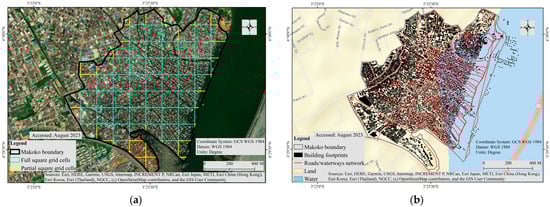 All these two maps show the slum situation in the Makoko area. (a) Grid cells of the Makoko location. The mapping of grid cells performed to determine the location and size of the informal settlement in Makoko; (b) map of irregular housing and road network conditions in Makoko.The map of Makoko, highlighting the disorderly arrangement of its roads and buildings.