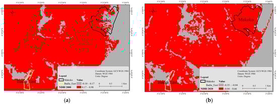 (a) Map of Makoko and Badia-East areas according to NDBI resulting from a satellite image 2000, where the red areas on the above map represent built-up areas, while the gray areas represent non-built-up areas. In the case of non-built-up areas, the NDBI values ranged from −0.10 to 0.17. This range indicates that non-built-up elements, including vegetation and water bodies, primarily characterize these regions. Conversely, the NDBI values for built-up areas in Makoko and Badia slums fell from 0.17 to 0.98. (b) Map of Makoko and Badia-East areas according to NDBI, resulting from a satellite image 2020. The NDBI values for the non-built-up areas ranged between −0.35 and −0.04. These values indicate a relatively low level of built-up infrastructure within these regions. In contrast, the NDBI values for the built-up areas fell between −0.04 and 0.66. Both maps were created using the ArcGIS base map.
