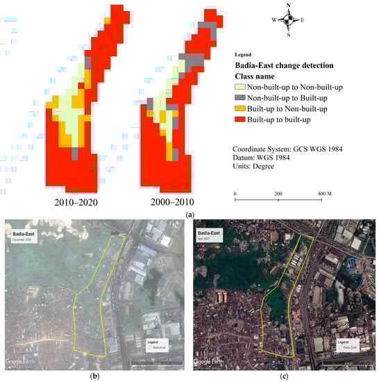 Figure 7 highlights the Badia-East change detection observed in color after classifying three different satellite images of 2000, 2010, and 2020.