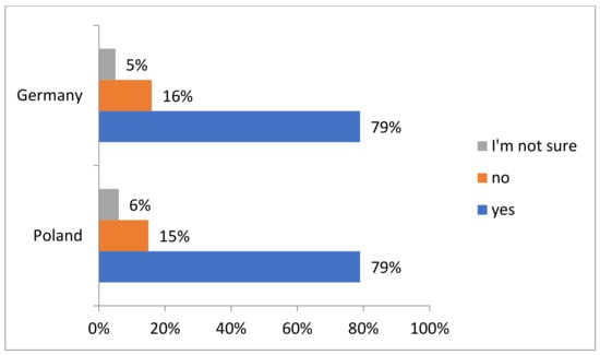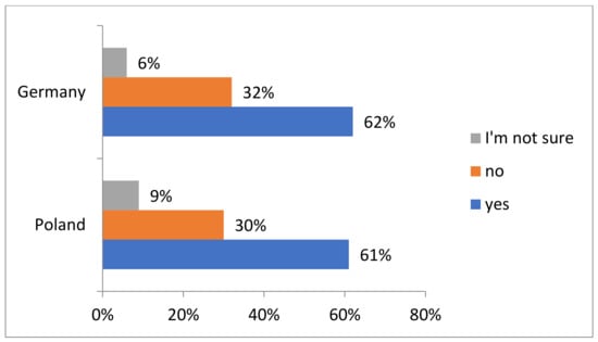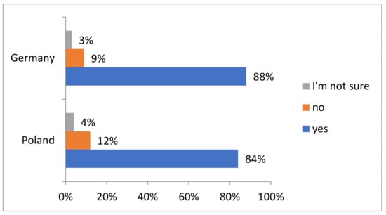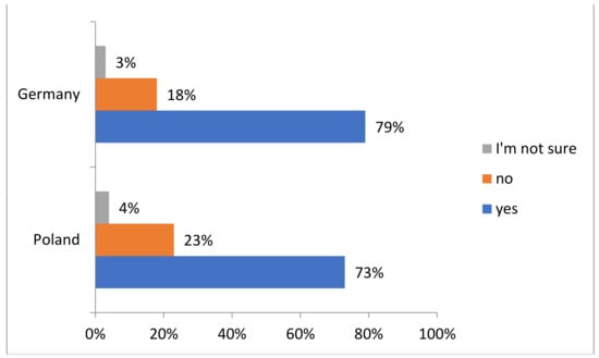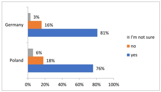 The data in Figure 8 concern the companies’ answers to the question whether they experienced the benefits of the active involvement of managers in corporate social responsibility (CSR) strategies. These benefits may include, for example, improving the company’s reputation, increasing employee engagement, improving relationships with customers and suppliers or achieving sustainability goals. In Poland, 550 out of 656 companies, which is 84%, confirmed that they experienced the benefits of the active involvement of managers in CSR strategies. On the other hand, 80 companies (12%) have not experienced such benefits and 26 companies (4%) are not sure. In Germany, out of 568 companies, 500 (88%) confirmed that they had experienced benefits, while 50 companies (9%) had not experienced benefits. In addition, 18 companies (3%) are unsure whether they have experienced benefits.