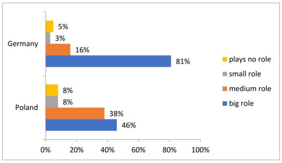 The data in Figure 7 refer to the role that managers play in promoting and implementing the corporate social responsibility (CSR) strategy in the company. This role may include, for example, setting the direction of the CSR strategy, coordinating CSR activities, promoting the value of CSR among employees and making decisions related to CSR. In Poland, 300 out of 656 companies, which is 46%, believe that managers play an important role in promoting and implementing CSR strategies. A total of 250 companies (38%) believe that managers play a medium role, 50 companies (8%) believe that they play a small role and 53 companies (8%) believe that managers do not play a role. In Germany, out of 568 companies, 280 (49%) think managers play a big role, 220 companies (39%) think they play a medium role, 40 companies (7%) think they play a small role and 28 companies (5%) believe that managers do not play a role. Most companies in both countries believe that managers play a large or medium role in promoting and implementing CSR strategies.