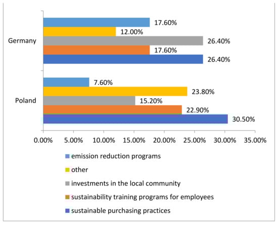 Comparison of Poland and Germany: Sustainable purchasing practices are more popular in Poland (30.5%) compared to Germany (26.4%). Sustainability training programs are more common in Poland (22.9%) than in Germany (17.6%). Investments in the local community are equally popular in Poland (15.2%) and Germany (26.4%). Emission reduction programs are less popular in Poland (7.6%) than in Germany (17.6%). Other CSR activities are much more common in Poland (23.8%) than in Germany (12%).