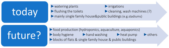 Currently, rainwater is collected primarily at single-family houses, or in public and commercial buildings, where its use was planned from the moment of design and construction. In the future, the share of multi-family houses in this group should increase significantly, although today, of course, there are also such buildings [14]. Figure 1 shows the possibilities of using rainwater in cities today and in the future.