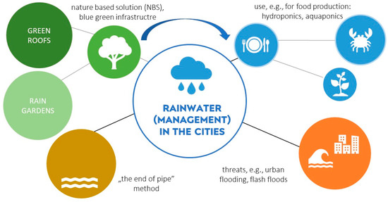 In times of changing climate when, on the one hand, cities are threatened by drought and lack of water supply and, on the other hand, there are heavy rainfalls causing urban flooding, it is extremely important to pay special attention to the possibilities of using precipitation in the cities of the future. The issue is not new, and rainwater has been a source of water supply since ancient times [1]. Rainwater and stormwater are an important element in the city’s water management system. If there is no decentralised intake of them, then in the case of combined sewage systems in cities, they will go to the municipal wastewater treatment plant, affecting its functioning by periodically changing both the quantity and quality of sewage supplied. It should also be added that sanitary sewage will be mixed with stormwater earlier with a significant difference in their quality before mixing. In turn, the intensification of activities related to the maximisation of the use of rainwater as an alternative source of water in the city may lead to easier management of municipal wastewater treatment plants and a more predictable amount and quality of urban wastewater during wet weather. Ultimately, this may also mean reducing the multiplicity of action of storm overflows in the case of combined sewage systems.