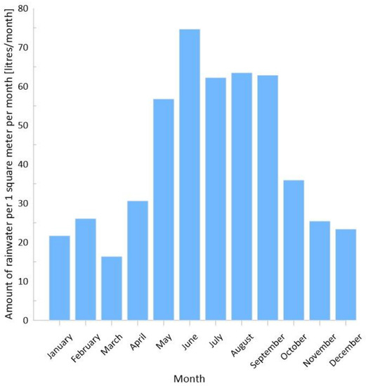 The average volume of rainwater that can be collected from 1 m2 of surface in Wroclaw during individual months of the calendar year, according to data for the Wroclaw Strachowice synoptic station for the years 2018–2022, without taking into account the runoff coefficient—own elaboration based on the IMGW—PIB data [26].