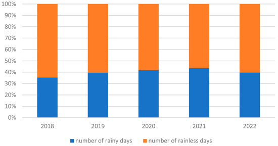 Number of rainy and rainless days in Wroclaw in 2018–2022, own elaboration based on IMGW—PIB data for the Wroclaw Strachowice synoptic station [26], for 2019—no data for 1 day a year.