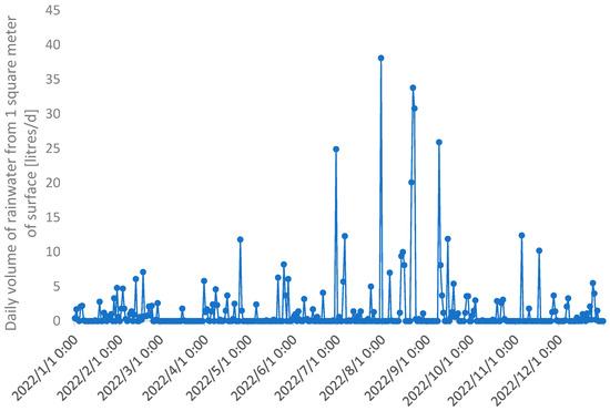 Daily volume of rainwater in litres in relation to 1 m2 of surface in Wroclaw according to data for the Wroclaw Strachowice synoptic station for 2022, without taking into account the runoff coefficient—own elaboration based on IMGW—PIB data [26].