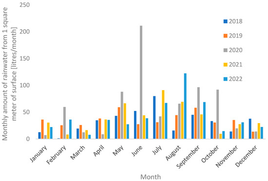 Monthly volume of rainwater in litres in relation to 1 m2 of surface in Wroclaw according to data for the Wroclaw Strachowice synoptic station for the years 2018–2022, without taking into account the runoff coefficient—own elaboration based on IMGW—PIB data [26].