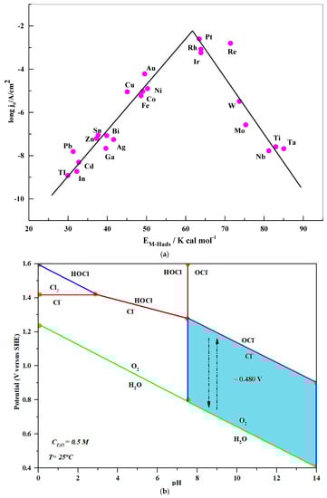 Bennett first recognized and highlighted this significant issue in 1980 [89]. He discovered that direct seawater electrolysis might lead to high current efficiency during the cathodic evolution of H2. However, a wide range of chloride ions are generally produced at the anode as part of a hypochlorite solution (ClO−). According to what was seen, the chemistry of chloride ions in aqueous solutions is complex, and chemical effects are possible with respect to pH, applied potential, and chloride ion concentration. Meanwhile, the connection between the exchange current densities (jo) of metal electrodes in an acidic solution and the active sites on the metal catalysts’ surfaces is being investigated, as shown in Figure 1a. According to [10,75,83,86], detailed analysis of the anodic seawater yielded a computed Pourbaix diagram that comprised the OER and chloride chemistry (Figure 1b).