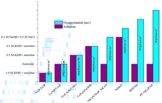 Three different types of electrolytes are commonly used for seawater electrolysis: an alkaline solution with NaCl, an alkaline solution with seawater, and seawater. The performance of HER-type solutions was improved by the electrolyte introduced into the alkaline environment, and the reported overpotential values were also enhanced, as shown in Figure 2.