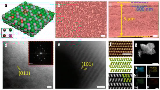 For instance, in [17], three steps including anodic processing, vapor deposition, and electrodeposition were applied for NiSe2 nanoporous film synthesis. As a result, the as-prepared nanocatalysts demonstrated impressive electrocatalytic performance and catalytic activity. In addition, Figure 3a presents the results of a simulative study of a crystal lattice for Fe, P-NiSe2 NF, and Figure 3b,c shows that the highly permeable films existed as part of Fe, P-NiSe2 NF and an FeNi alloy substrate on the surface. Consequently, in both the ABF and HAADF STEM images, NiSe2’s crystallized structure and lattice fringe were visible (Figure 3d–f). Likewise, four compounds were observed with homogeneous distributions, such as P, Ni, Fe, and Se, as presented in Figure 3g,h. Additionally, an overpotential of 120 and 180 mV was considered necessary in the basic solution (0.5 M KOH) with 90% infrared adjustment to produce current densities of 100 and 500 mA cm−2.