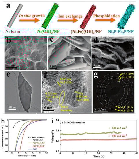 Previous studies showed the advancement of an in situ nickel foam (NF) nickel–exchange phosphorylation electrocatalyst. It can change the local distribution of electrons for the central metal, making it easier to create low-cost, high-performance seawater electrolytic catalysts. For instance, the authors in [11] used phosphatization and acidification to create an Ni2P-Fe2P/NF electrocatalyst with a 2D nanosheet structure. Similarly, the results in [39] demonstrated that the Ni2P-Fe2P/NF catalyst with a two-dimensional nanosheet structure, prepared using acidification and phosphating methods, exhibited excellent intrinsic activity (Figure 4a).