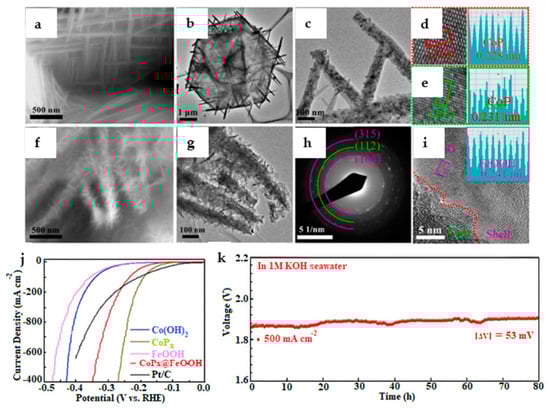 Further, the authors in [18] focused on the preparation of a catalyst with a core–shell structure manufactured using a three-step process of hydrothermal-phosphatization-electrodeposition. It is widely known that CoPx precursors present smooth straight NWs and diverse CoP2 distributions, as shown in Figure 5a–e. According to the SAED and HR-TEM images shown in Figure 5f–i, the core–shell structure remained with CoPx as the core and FeOOH as the shell. Furthermore, with current densities of 100 and 500 microamps, the catalyst had a lower overpotential and long-lasting durability over 80 h in seawater containing 1 M KOH (Figure 5j,k). In this study, the catalyst was active and stable due to the corrosion-resistant layer of its basic structure, demonstrating that structural design is critical for catalyst performance.