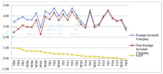 By calculating the gap of the 26 indexes of collected adoption levels in foreign- and non-foreign-invested companies, it can be seen that there are only two negative gaps, while the 24 other values are higher than zero. (Figure 2) In general, nearly all companies that received capital from foreigners applied low-carbon-emission operations more widely than those that only received domestic investment. In this case, the largest gaps belong to activities that require a significant budget for investment in properties, such as the means of transportation, control system, environmentally friendly systems, or other kinds of long-term changes such as fuels. In addition, the smallest gaps relate to optimising the usage of companies owning low-value items such as lighting equipment.