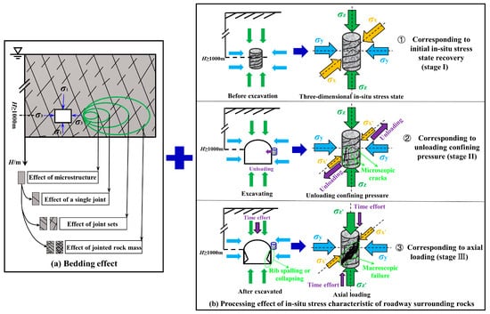 However, the unloading effect is not considered in the above studies. In addition, there is significant anisotropy in the deep strata itself (see Figure 1a). Furthermore, there exists the obvious evolution process of the stress state of roadway surrounding rocks before excavation, during excavating and after excavation (see Figure 1b). Therefore, the stress path TLUT considering the unloading effect was proposed [36,37]. Furthermore, it was expected to improve the accuracy of the applicability of the strength criteria.
