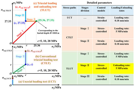 Figure 2. Stress paths and corresponding detailed parameters [38,39]. Note: c represents different pre-set confining pressures; σ 1 c f , UCT represents uniaxial compressive strength of layered sandstones; σ 1 c f , CTLT represents triaxial compressive strength of layered sandstones under CTLT; σ 1 c f , TLUT represents triaxial compressive strength of layered sandstones under TLUT.