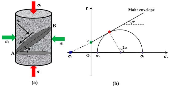 Figure 4. M-C strength criterion: (a) stress analysis; (b) strength envelope of shear and normal stresses [46,47].