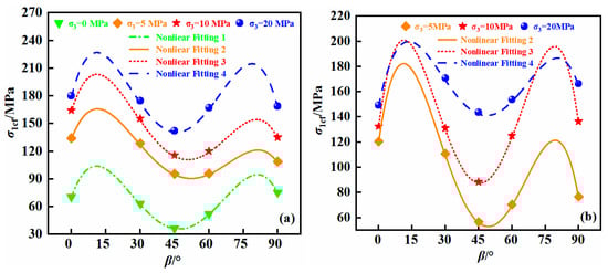 Figure 5. Fitting relationship between the peak strength and bedding angle under various confining pressures: (a) CTLT; (b) TLUT.