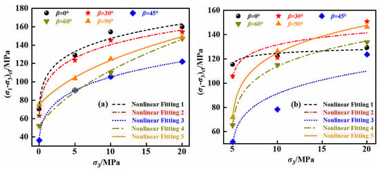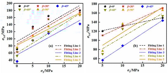 Figure 6. Fitting relationship between the peak strength and confining pressure under various bedding angles: (a) CTLT; (b) TLUT.