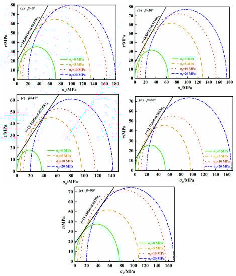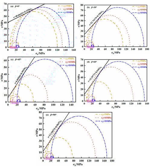 Figure 8. Mohr circles and strength envelopes under TLUT under different bedding angles: (a) β = 0°; (b) β = 30°; (c) β = 45°; (d) β = 60°; (e) β = 90°.