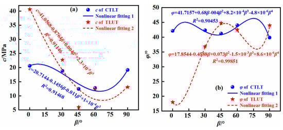 The variation of strength parameters with different bedding angles under CTLT and TLUT is shown in Figure 9. As shown in Figure 9, the cohesion and the internal friction angle under CTLT and TLUT showed a significant nonlinear polynomial function relationship with the bedding angle, and the specific expressions are as follows: