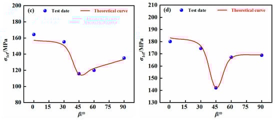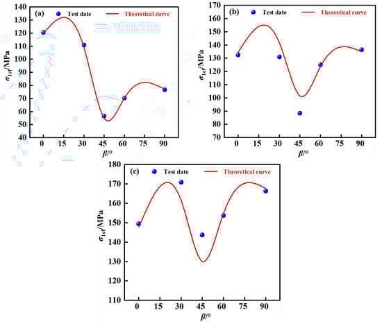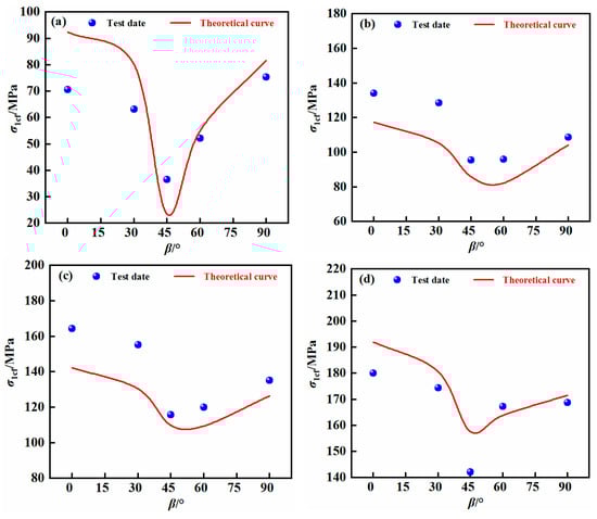 To further quantify the anisotropy on the peak strength, a functional relationship between the peak strength and the bedding angle was established. As shown in Figure 5, the fitting function relationship between the peak strength and the bedding angle under identical confining pressure is as follows: