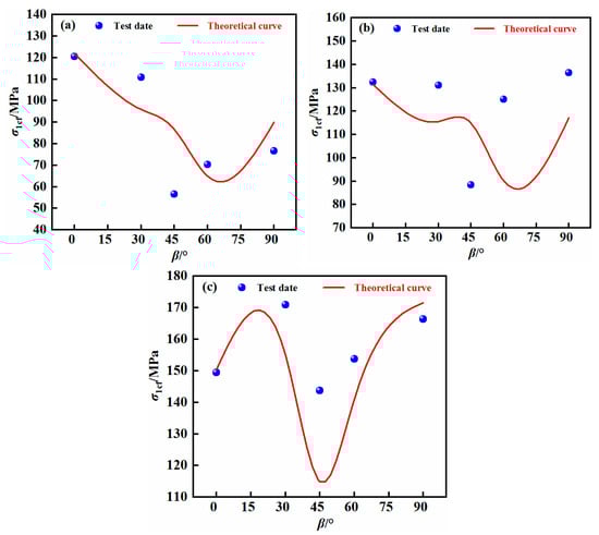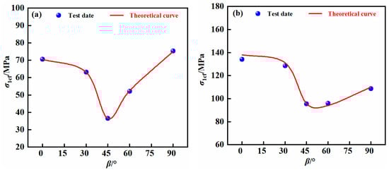 To further verify the applicability and reliability of the M-C strength criteria, the theoretical peak strength under various confining pressures and different bedding angles was calculated according to Equation (11) (see Table 5).