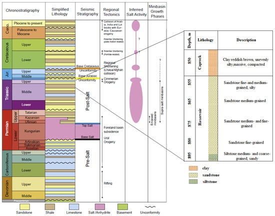 A lithostratigraphic sequence of Eastern Precaspian basin and Ebeity Reservoir. Adapted with permission from Duffy et al. [8]. 2023, Elsevier.