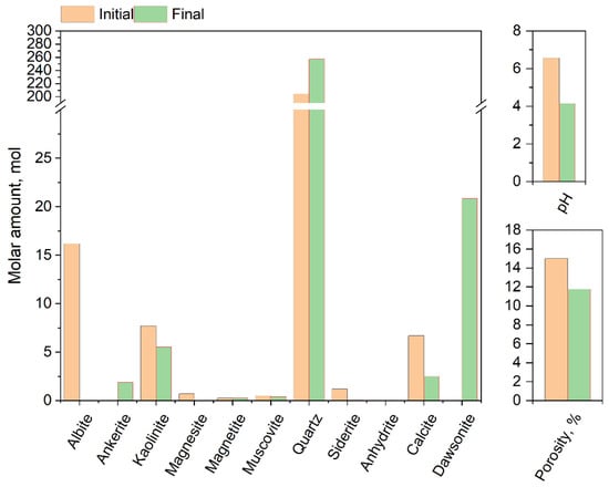 Moreover, SiO2(aq) ions were mainly consumed to form quartz. The reactions increased the acidity of the brine solution and, ultimately, the pH was equilibrated at 4.14. The geochemical reactions among the rock–brine–CO2 resulting from the CO2 injection caused the dissolution of calcite, albite, magnesite, muscovite, kaolinite, and siderite, and the precipitation of quartz and secondary carbonates, such as ankerite and dawsonite (Figure 3). It is suggested that successful CO2 sequestration via in-situ carbonation and storage could be determined by the abundance of relevant minerals, such as ankerite and dawsonite, precipitations of which can increase the CO2 storage capacity of the reservoir. The change in the mineralogical composition induced by the CO2 was closely related to the change in the reservoir porosity, showing a 4% decrease in porosity. The higher content of precipitated minerals led to a decrease in the porosity.