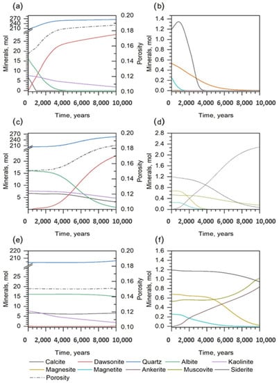 Evolution of mineral contents and porosity estimated over 10,000 years at different locations: (a,b) CO2 injection point; (c,d) 20 m, and (e,f) 40 m from the injection point.