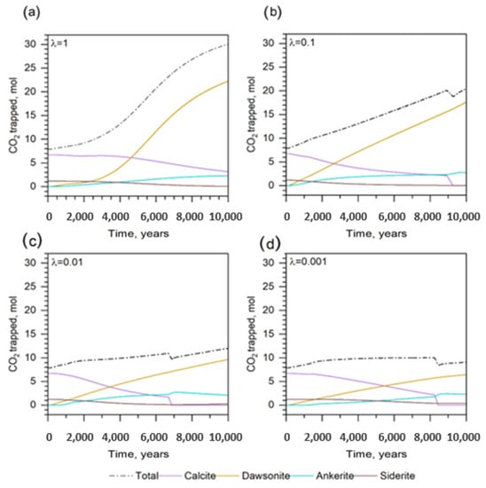 The formation of carbonates through CO2 injection was investigated under different surface area conditions. Figure 6a–d showed the effect of the reactive surface area fraction (i.e., λ-factor showing the availability of surface to interact with other geochemical species such as H+) on the abundance of secondary minerals. The estimation results illustrated the contribution of dawsonite formation to the total CO2 trapped in the reservoir (Figure 6a–d). Under the base case conditions (λ = 1), the molar concentration of dawsonite increased remarkably after 4000 years, reaching the final value of 24 mol/kgw (Figure 6a). Whereas, at lower λ-ratios, the growth rate of dawsonite remained stable (Figure 6b–d). A decrease in λ from 1 to 0.001 showed a four-fold reduction in dawsonite formation, resulting in 6 mol/kgw at the end of the estimation (Figure 6d). The available surface area of aluminosilicate minerals to interact with geochemical species was limited as the λ-factor decreased; therefore, the dissolution of albite and kaolinite led to decreased dawsonite precipitation compared to the base case. This resulted in the decreased mineralization of CO2; thus, limited dawsonite and ankerite were formed. A low surface area limits the aluminosilicate mineral’s reactivity and slows down the formation of dawsonite. Calcite, a primary mineral, was removed through its dissolution following the CO2 injection throughout the estimation (Figure 6a–d). Except for the base case, it was dissolved entirely at ~9200, ~7000, and ~8500 years, for λ = 0.1, 0.01, and 0.001, respectively (Figure 6b–d). The limited reactivity of aluminosilicate favors the suitable condition for calcite dissolution via the reaction with H+ ions. As calcite was assumed to be in equilibrium during the estimation, the effect of the reactive surface area at different λ-factors on its dissolution kinetics was not investigated. Siderite was also completely dissolved in four cases (Figure 6a–d). The slowest reaction kinetics was observed at λ = 0.001 for calcite and siderite (Figure 6d). The results confirmed the function of the surface area factor on the interaction kinetics. Ankerite experienced a relatively negligible effect from the decrease in surface area, and its content gradually increased to the maximum amount of 3 mol/kgw (Figure 6a–d). The highest ankerite content was observed in the base case and at λ = 0.1 (Figure 6a,b), while its content decreased by two-thirds at λ = 0.01 and 0.001 (Figure 6c,d). This may indicate the limited source of chemical species available in the brine to form ankerite. Therefore, the last two cases were unfavorable for safe gas injection because it can limit the mineralization of CO2.