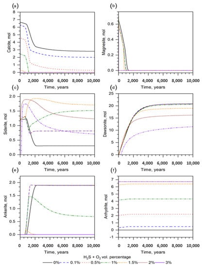 Figure 8a shows the effect of the mixed gases on the calcite dissolution via CO2 injection. The calcite dissolves continuously, with a quick drop at an early stage, and is eventually stabilized by its slight and slow decrease. The calcite dissolution kinetics increased as the mixed gas volume fraction increased—e.g., even if it cannot be present at 2 and 3%. Magnesite, another carbonate, dissolved completely and released Mg2+ to the bulk brine solution to form secondary magnesium-containing minerals (Figure 8b). Siderite exhibited a distinct behavior under the specified geochemical conditions (Figure 8d). Its content was originally 1.1 mol/kg at a 1% mixture gas volume fraction; it gradually increased as the corresponding calcite dissolved at 1200 years, reached 1.5 mol/kg at 6000 years, and stayed constant throughout the estimation. The lowest content at equilibrium (0.3 mol/kgw) was observed in the base case (0%), and the highest content (1.7 mol/kgw) was marked at 1.5%. The siderite formation at 2 and 3% reached its peak value (1.7 and 1.9 mol/kgw) after 1100 years, and it dissolved to 1.2 and 0.7 mol/kgw, respectively, providing the bulk brine with a Fe2+ source to promote ankerite precipitation. Therefore, the reservoir brine was enriched by Ca2+, Fe2+, Mg2+, and HCO3− due to calcite, siderite, and magnesite dissolution. Together with the dissolved carbon species, the cations can promote the formation of minerals such as ankerite and dawsonite (Figure 8c,e). A further addition of CO32− to the brine was required to increase their contents; however, their formation kinetics slowed down after 2000 and 4000 years, respectively, due to the complete dissolution of calcite and the limited availability of Ca2+. The dawsonite content showed a maximum value of ~20 mol/kgw at a 1% mixed gas volume fraction and lower (Figure 8c). The increase in the mixture gas volume fraction inhibited its formation by prevailing the SO2 activity over the dissolved CO2 species. The formation of ankerite was observed at 0–1%, and its content reached a maximum of 1.9 mol/kgw, showing an inversely proportional dependence on the mixed gas volume fraction (Figure 8e). A relatively minor fraction (i.e., 0.1 and 0.5%) of H2S–O2 resulted in a higher formation rate of ankerite, with the exception of the base case. Once calcite was dissolved entirely at 1% after 1200 years, the formation of ankerite was limited, and further dissolved to 0.7 mol.