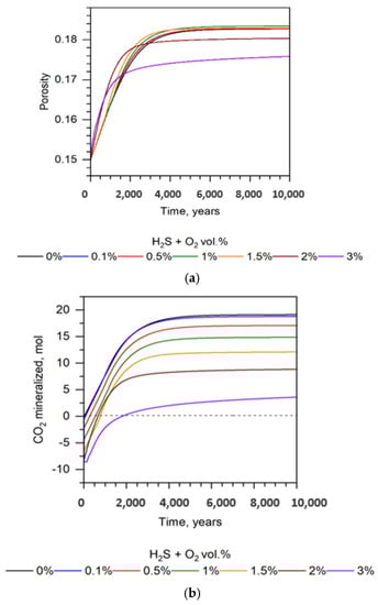 Figure 9b shows the effect of the mixture gas volume fraction on the extent of the mineralization of the injected CO2 in 10,000 years. The lowest amount was obtained at a 3% mixed gas fraction, where, based on the estimation results, 3 mol/kgw was mineralized. The base case showed the highest CO2 fixation, reaching 19 mol/kgw. Moreover, as the volume fraction of H2S–O2 increased to 1.5%, the maximum possible CO2 sequestration via mineralization decreased by two times. Thus, a significantly lower mineralization amount was observed in the presence of, and increase in, gas impurity. The purification of mixed CO2 gas to a certain purity degree needs to be implemented for safe and successful CO2 sequestration and storage before its injection. According to Wang et al. [65], H2S could cause fewer issues regarding the integrity of the reservoir than other impurities. It is also stated that sulfates may decrease the porosity and permeability. The oxidation of H2S, consequently forming sulfuric acid, leads to geochemistry alterations in the medium; therefore, CO2 injectivity depends on the level of purification.