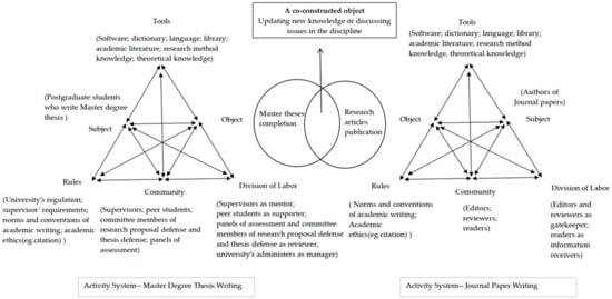 Activity Theory has been used to explore L2 student–professor interactions in L2 disciplinary writing [34], academic publication of doctoral candidates [35], and peer feedback in L2 writing [36], but it is seldom applied in thesis writing research. Our study addresses two questions from the perspective of Activity Theory: