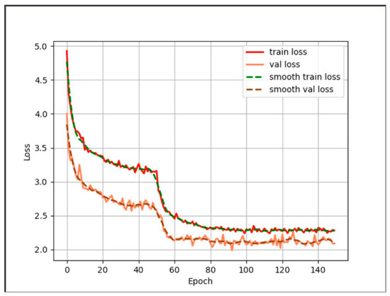 In terms of training performance, the loss value of the improved YoloX-S network and Yolov8 model was lower than that of the other five models, indicating better convergence effects and improved performance. The variation of the loss value with epoch value in the training process of the improved YoloX-S model is shown in Figure 6. The loss value gradually decreased with the number of training rounds, and the loss curve converged at around 2.25 after approximately 140 rounds.