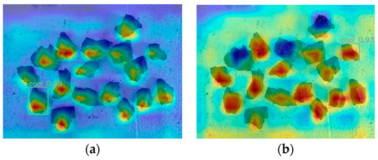 The improved YoloX model achieves a higher confidence (0.89–0.94) in detecting coal than the original YoloX model (0.85–0.92) (Figure 11a,b). Moreover, the improved model effectively distinguishes coal from biomass fuels, meaning that it has the potential for application in the monitoring of illegal coal burning in biomass boilers.