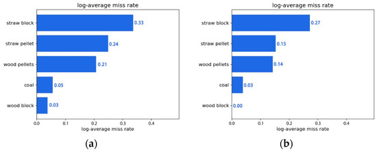 Figure 9 and Table 3 compare the missed detection rates of the five fuel targets with and without the CoT block. The results indicate that both methods exhibit high precision in fuel identification, with the average accuracy of the improved YoloX-S algorithm (96.60%) surpassing that of the YoloX-S algorithm without the CoT module (95.40%) after 150 cycles. The data demonstrate that the improved model reduces the missed detection rates of straw blocks, straw pellets, wood pellets, coal, and wood blocks by 6%, 9%, 7%, 2%, and 3%, respectively (Figure 9).
