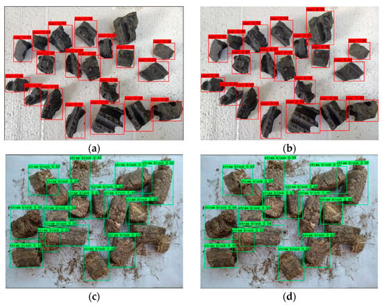 Figure 11c–f show the detection results of straw and wood blocks. The improved YoloX model achieves a higher confidence (0.90–0.92) in detecting wood blocks than the original YoloX model (0.89–0.91). However, the original and improved models exhibit low confidence (0.52–0.69) in detecting straw blocks and actually missed some objects. This was attributed to the similarity in features between the straw pellets and wood pellets and their dense distribution.