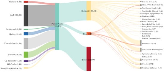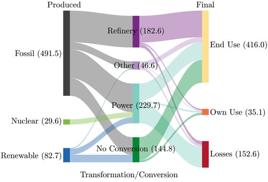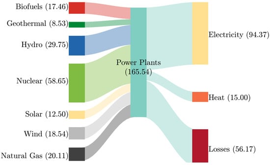 Power flows in electricity generation. This Sankey diagram is a detailed and expanded version of the Power transformation reported in Figure 1. The units are , and the reference year is 2018. The data from IEA [] are plotted using a modified version of [].