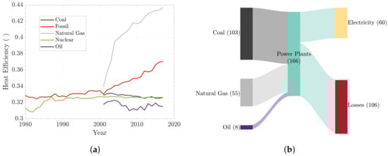 Heat efficiency of electricity generation from fossil fuels. (a) Heat efficiency for different sources in the United States. (b) World’s fossil power Sankey’s diagram. Fossil fuels power the flow, units are in . Losses include heat that could be recovered through cogeneration or other approaches. The data are from EIA [], IEA []. (b) was plotted using a modified version of [].