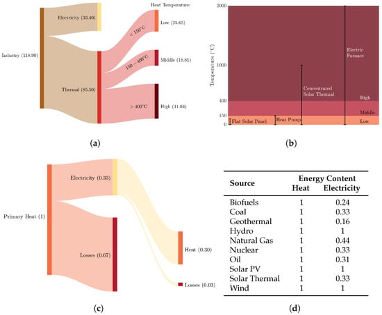 Rates of heat and work generation. (a) Industry power flow with thermal power detailed, units are in . The data are from IEA [], Solar Payback []. (b) Potential technologies and working temperatures. (c) Heat conversion flow and losses towards a process that converts heat into electricity and then converts it back into heat. (d) Energy content available as heat and electricity for selected fuels/technologies [,,]. (a,c) plotted using a modified version of [].