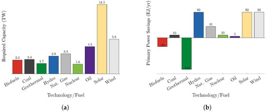 Figure 8b shows the amount of primary power that could be saved from the deployment of a specific technology to generate electricity. Hydropower, solar PV, and wind provide the maximum savings, because they generate electricity directly. The savings from other sources depend on their heat efficiencies. Interestingly, even if powered with fossil fuels, electrification results in power savings. However, when electrification is powered by geothermal or biofuels, there are no savings in terms of primary power. The overall thermodynamic efficiency of using biofuels to generate electricity is also inherently low, and their global ecological impacts are high [,,].