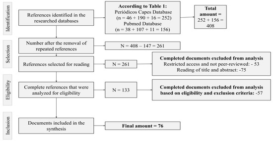 Starting the second stage, a table was created with all the main data (title, authors, abstracts, and full references) of the 408 articles found in the two databases, in order to aid the search for repeated documents. A total of 147 repeated articles were found, of which 111 were in the PubMed database and 36 in the Periódicos Capes database. After removing the duplicate articles, primary exclusion criteria were established to select the articles. These criteria included the exclusion of articles that were not freely available and scientific articles from journals that did not go through the peer review process, thus ensuring the quality of the articles, especially on the Periódico Capes platform. In addition, a sifting was performed by reading the titles and abstracts of all publications, resulting in the exclusion of 75 articles.